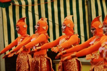 Ankunft des Festzuges zum Abholen des Königspaares mit Hofstaat am Sonntagnachmittag.